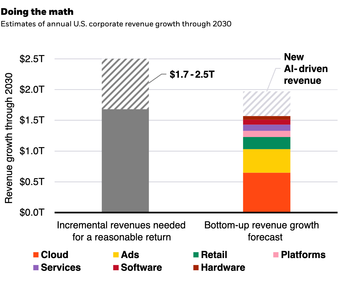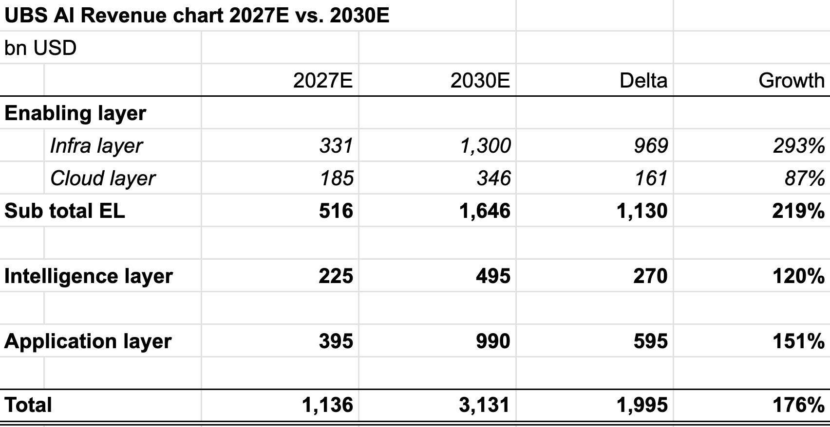 UBS forecasts USD 3.1 trillion in AI revenue by 2030, implying a roughly 30% six-year CAGR across the enabling, intelligence, and application layers.5