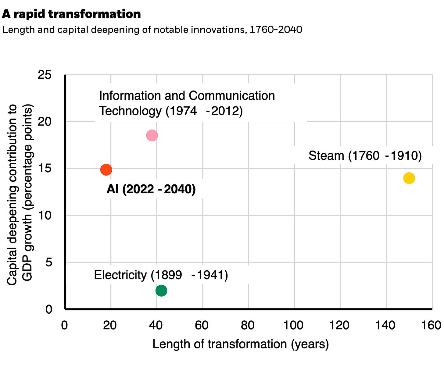Read together with the chart above, this puts AI into a different historical category. Unlike steam or electricity, the capital deepening is happening faster, at greater intensity, and over a much shorter window. That combination is rare - and it is exactly what defines a genuine economic supercycle (aka: Kondratieff).3