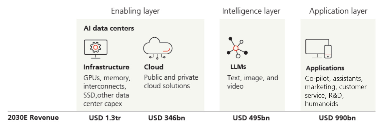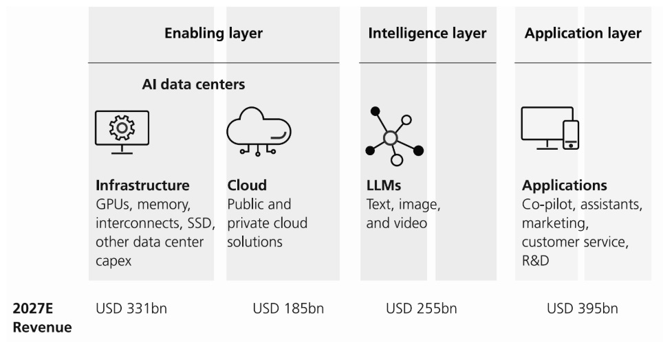 UBS recently published a chart that splits AI into three layers:4