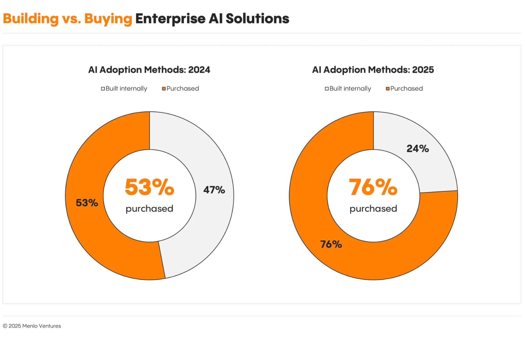 Menlo’s latest enterprise data shows the same thing from another angle: buyers are increasingly choosing ready-made AI products instead of building everything themselves.16