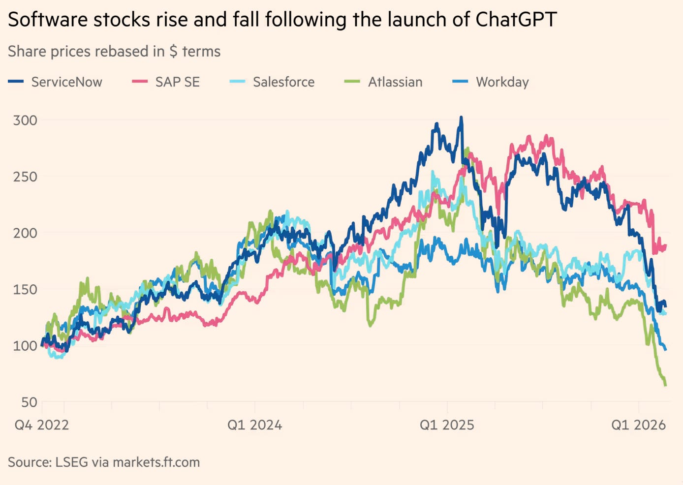 Now add the human label the FT used: FOBO — fear of becoming obsolete. That’s what’s driving the “shoot first, ask questions later” behavior in software. Or: selling software stocks without thinking … panic-mode.