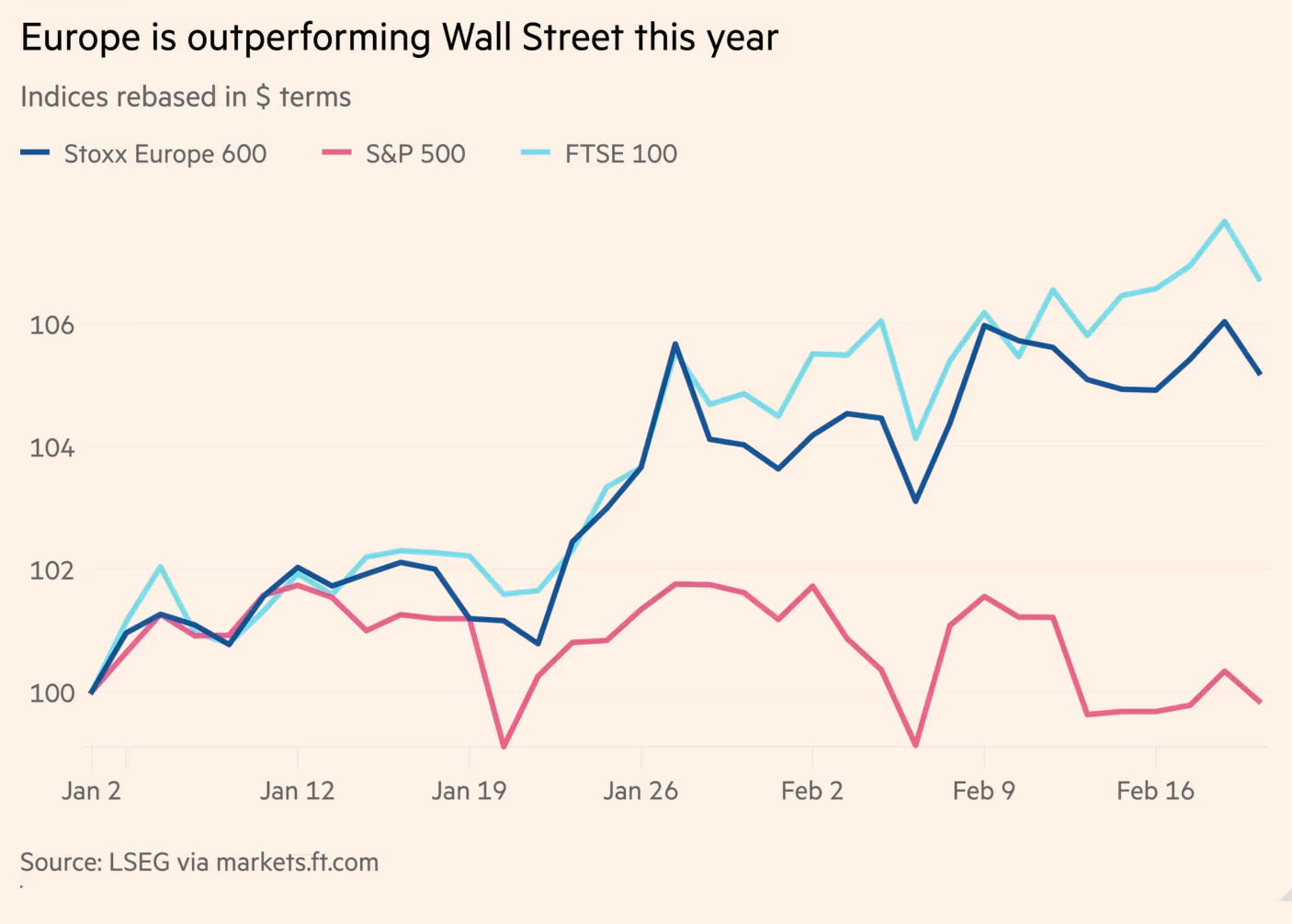 They are not buying European AI leadership. They are buying diversification away from US tech concentration — and a valuation gap. The same FT piece says it directly: investors want different exposure, and Europe “has less tech.” It also cites the valuation spread: the Stoxx Europe 600 around 18x earnings versus roughly 27x for the S&P 500 (per LSEG, as quoted by FT).25