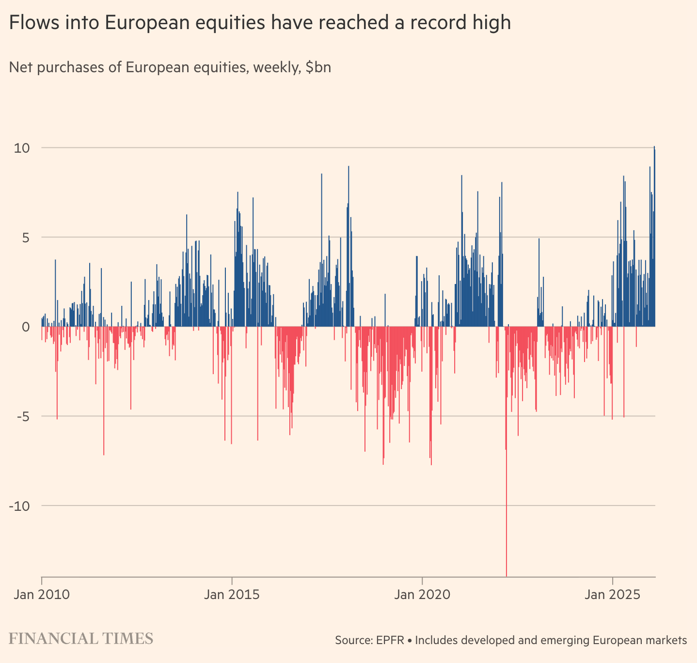 Europe is getting real inflows right now. No debate. The FT reports European equities are on track for their highest ever monthly inflows in February, with two consecutive record weekly flows of about $10bn, based on EPFR data.23