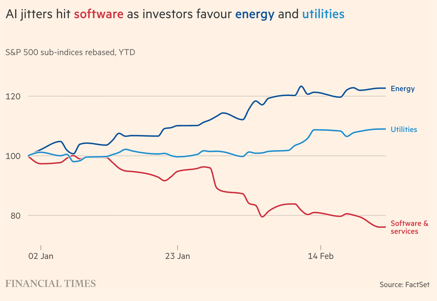 One more detail from Tuesday’s bounce matters: investors didn’t just sell software — they rotated into “tangible asset” sectors. Utilities, energy, and materials have been winners in 2026. One strategist called them “Halo” stocks: heavy asset, low obsolescence.8