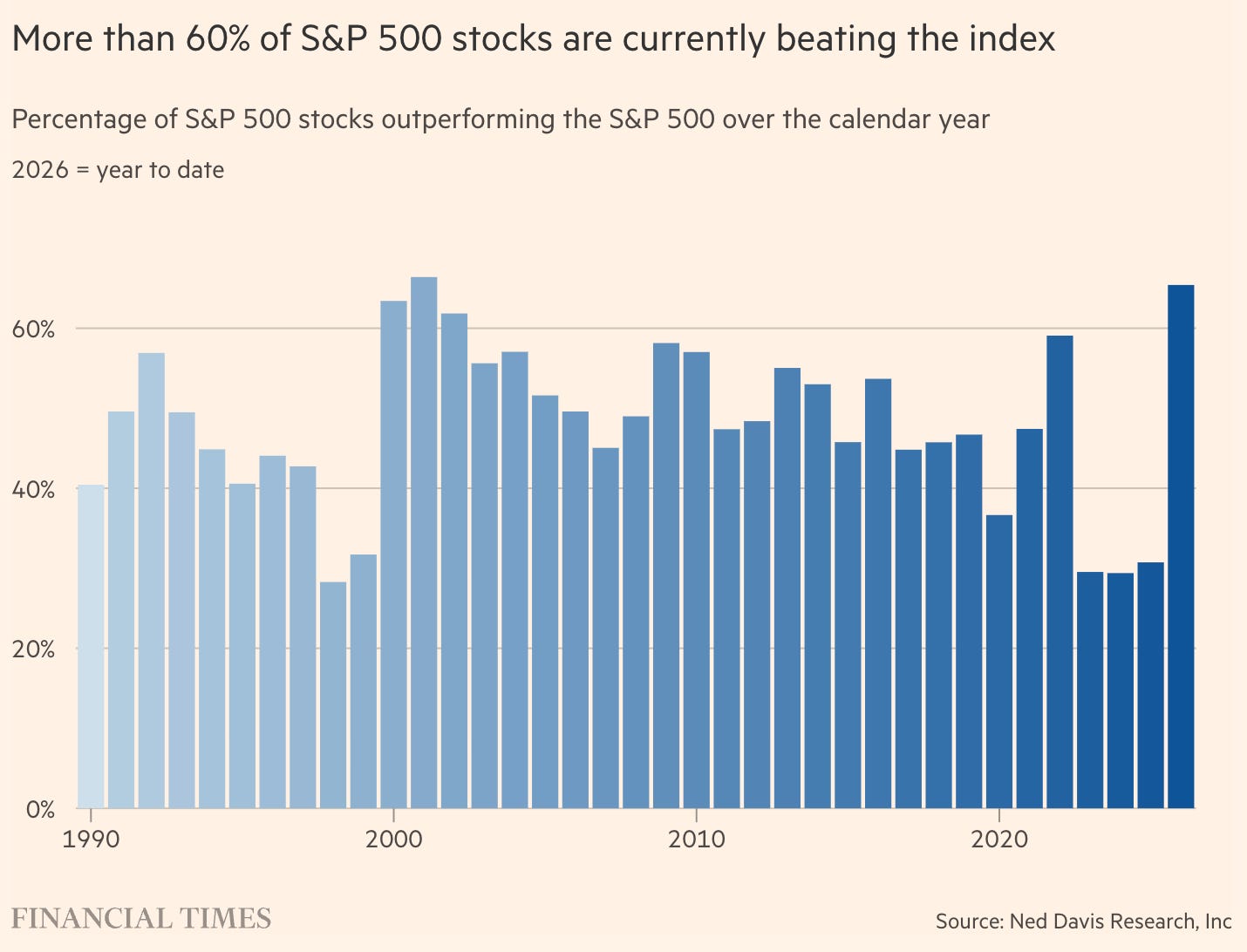 The FT reports that more than one-fifth of S&P 500 stocks have already moved up or down by more than 20% this year, even while the index treads water. It also notes the gap between large single-stock moves and subdued index performance is the highest since 2009, with Citadel Securities calling dispersion “extreme.”4
